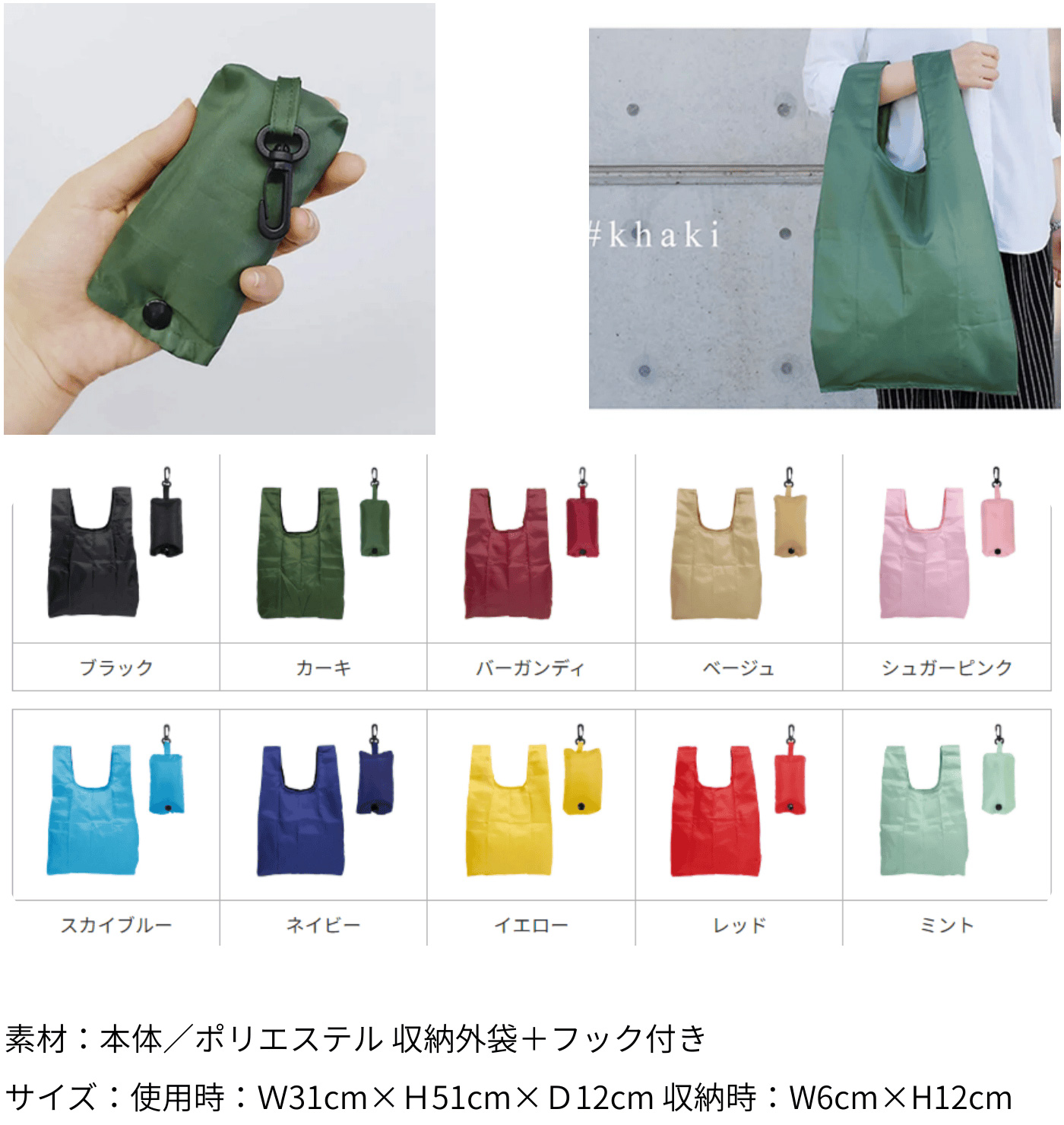 くるっと丸めて付属のポーチに収納できるため、持ち歩きにもとっても便利なエコバッグです。